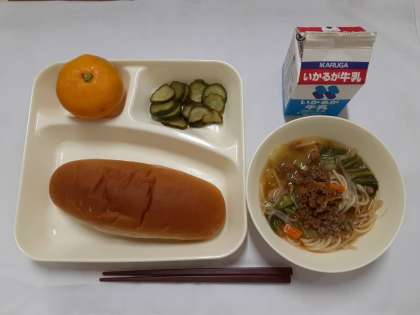 今日の給食は「タンタン麺、きゅうりの甘酢づけ、みかん、黒糖パン、牛乳」でした。