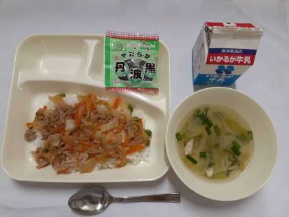 今日の給食は「ピリ辛丼、中華スープ、ソフト黒豆、ごはん、牛乳」でした。