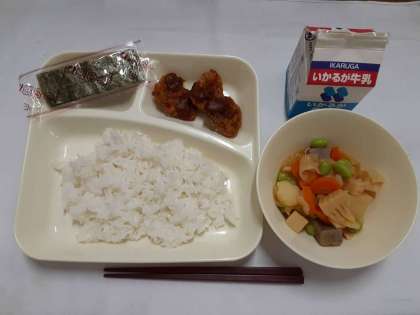 今日の給食は「みそカツ、じゃがいもと野菜の煮もの、焼きのり、ごはん、牛乳」でした。