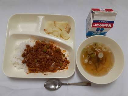 今日の給食は「タコライス、もずくのスープ、焼きじゃが、牛乳」でした。