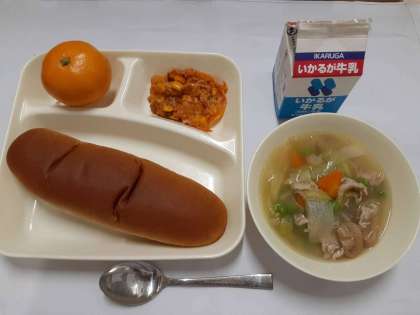 今日の給食は「豚肉と野菜のスープ煮、変わりピザ、みかん、黒糖パン、牛乳」でした。
