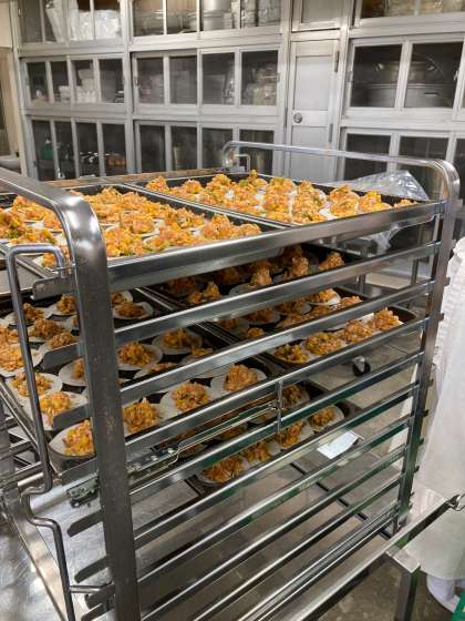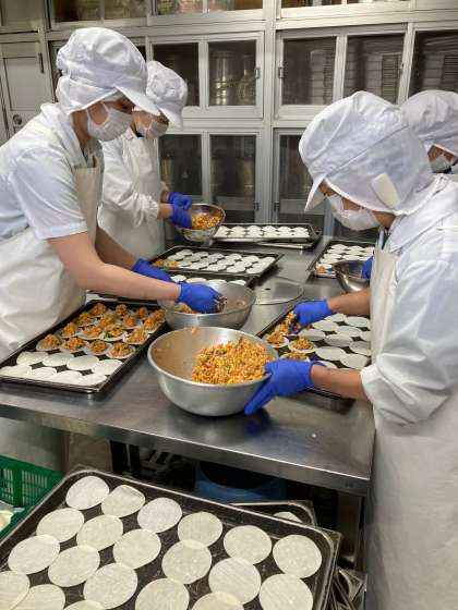 写真は調理員さんたちが、895人分の変わりピザの盛り付けをしてくれているところです。