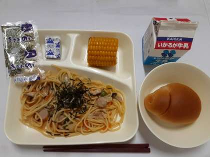 今日の給食は「ウインナーときのこの和風スパゲッティ、焼きとうもろこし、固形チーズ、黒糖パン、牛乳」でした。
