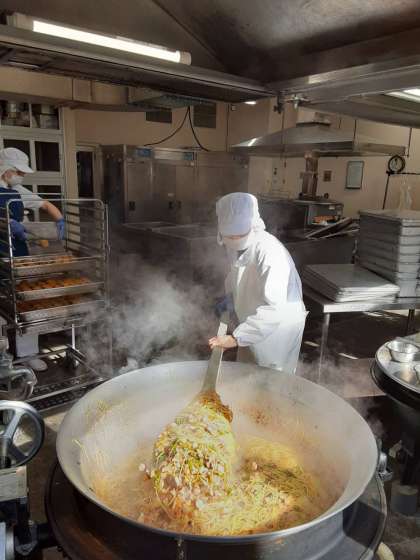 ウインナーときのこの和風スパゲッティは、調理員さんたちが、三つの釜を使って作りました。