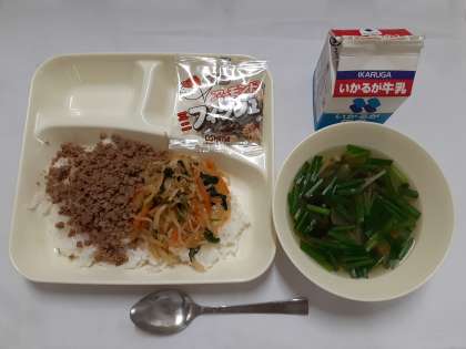 『ビビンバ、わかめスープ、アーモンドフィッシュ、牛乳』でした。