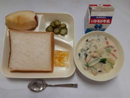 今日の給食は「きのこのクリームシチュー、きゅうりのバジル風味サラダ、りんご、食パン、牛乳」でした。