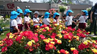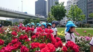 五月晴れの中、中之島バラ園に出かけました。色とりどりのバラにうっとり・・・。「このバラ、せっけんのにおいする!」「これはいちごみたいに甘いにおいやぁ」と自分のお気に入りのバラを探しました。