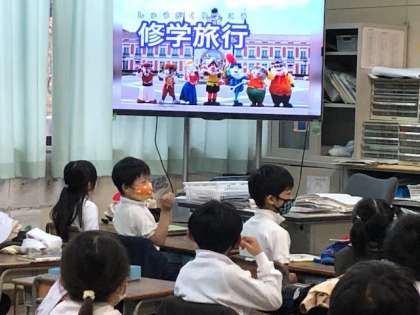 今朝の朝会では、6年生から楽しかった修学旅行の報告がありました。
