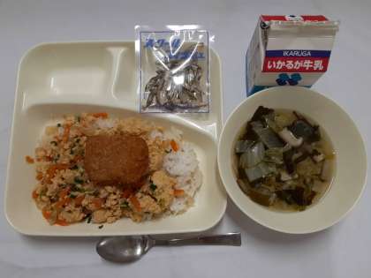 今日の給食は「カツ丼、すまし汁、ミニフィッシュ、牛乳」でした。
