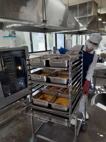 写真は、調理員さんがプリンを焼きもの機で焼いているところです。