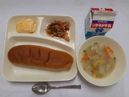 今日の給食は「豚肉のケチャップソテー、コーンスープ、焼きプリン、黒糖パン、牛乳」でした。