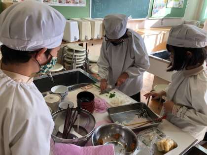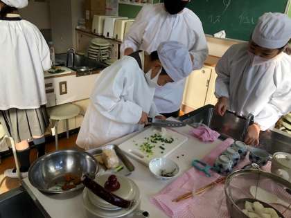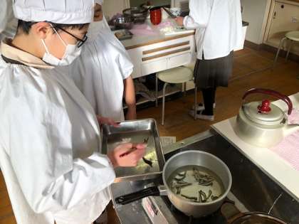 班のみんなで作業の手順や方法を確認し教え合いながら、調理実習は進みます。