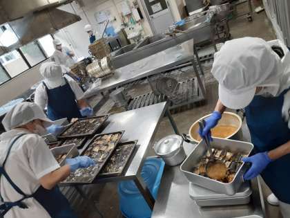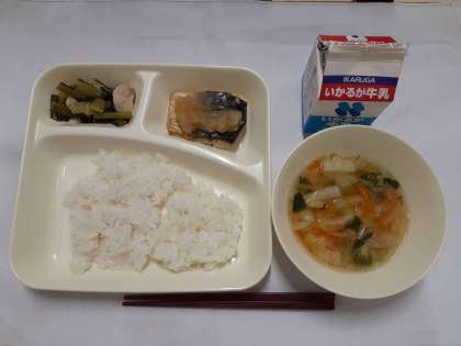 今日の給食は「さばのみぞれかけ、すまし汁、こまつなの煮びたし、ごはん、牛乳」でした。