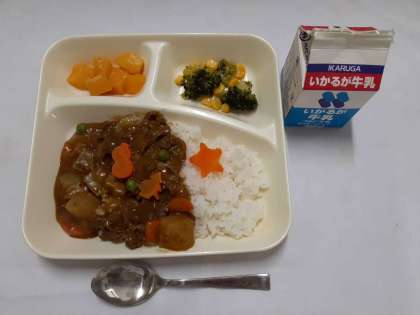 今日の給食は「冬野菜カレーライス、ブロッコリーとコーンのサラダ、黄桃(缶)、牛乳」でした。