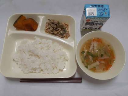 今日の給食は「豚肉と干しずいきのみそ煮、うすくず汁、焼きかぼちゃの甘みつかけ、ごはん、牛乳」でした。