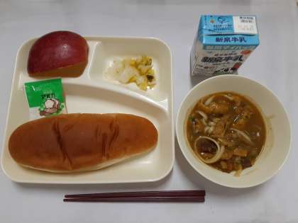2学期最後の今日の給食は「カレーうどん、白菜の甘酢あえ、りんご、コッペパン、牛乳」でした。