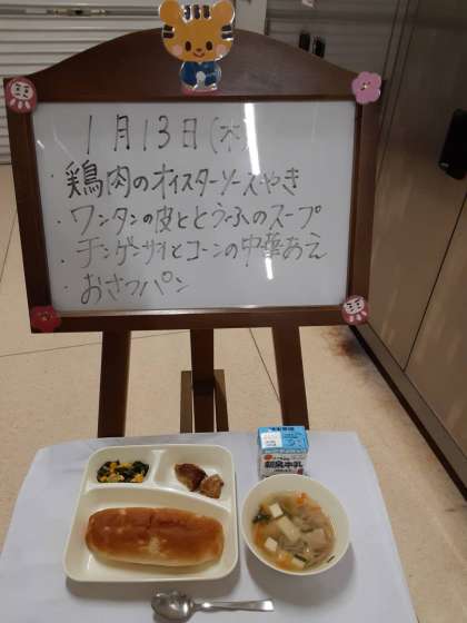 今日の給食は「鶏肉のオイスターソースいため、ワンタンの皮ととうふのスープ、チンゲンサイとコーンの中華あえ、おさつパン、牛乳」でした。