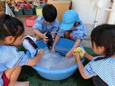 そこで・・・みんなでじゃぶじゃぶお洗濯。水の感触、服がきれいになる感覚、とっても気持ちよかったですね!