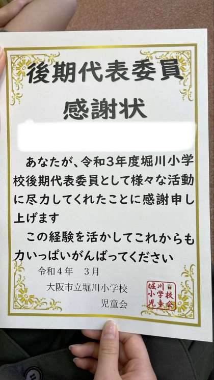 後期代表委員として、様々な活動に尽力したことに感謝を込めて、校長先生より感謝状をいただきました。
