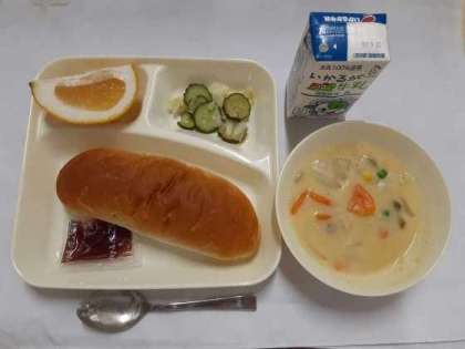 「コーンクリームシチュー、キャベツときゅうりのサラダ、河内ばんかん、コッペパン、いちごジャム、牛乳」でした。