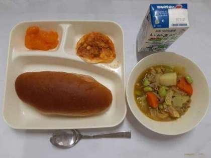 「豚肉と野菜のカレースープ煮、変わりピザ、みかん(缶)、黒糖パン、牛乳」です。