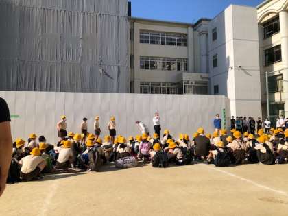 今日から2日間、6年生は修学旅行です。青空の下、出発式が行われました。