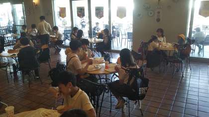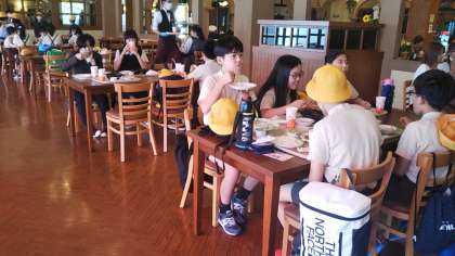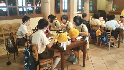 スクールメニューから好きなものを選んで食べています。どの乗り物に乗るか作戦会議です。