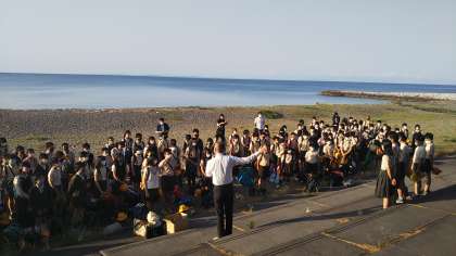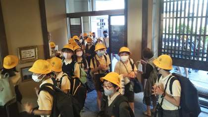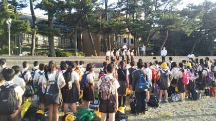 お世話になるお宿に到着しました。みんなで、宿舎の方にごあいさつです。