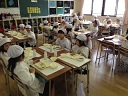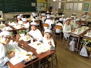 今日は、6年生と1年生、5年生と2年生、4年生と3年生が各教室に分かれて一緒に給食を食べました。違う学年の子どもたち同士で班をつくり、楽しくお話をしながらいただきました。