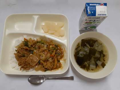 「和風カレー丼、すまし汁、和なし(カット缶)」です。