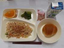「和風やきそば、オクラの甘酢あえ、オレンジ、黒糖パン、牛乳」です。
