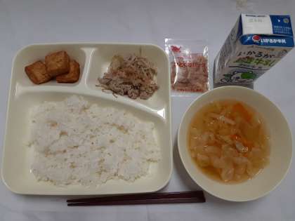 「豚肉ともやしのいためもの、すまし汁、あつあげのしょうがじょうゆかけ」です。