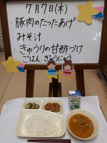 「豚肉のたつたあげ、きゅうりの甘酢づけ、みそ汁、ごはん、牛乳」です。