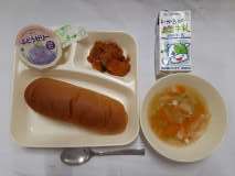 「かぼちゃのミートグラタン、スープ、ぶどうゼリー、黒糖パン、牛乳」です。