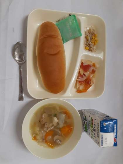 「鶏肉とてぼ豆のスープ、じゃがいもとトマトのチーズ焼き、もやしとコーンのソテー、コッペパン、りんごジャム、牛乳」です。