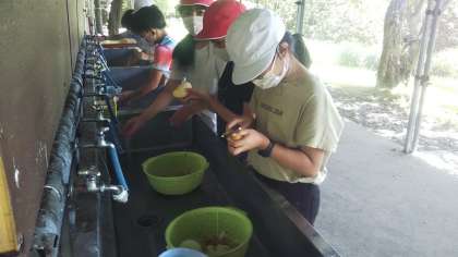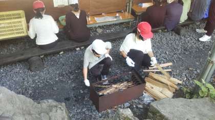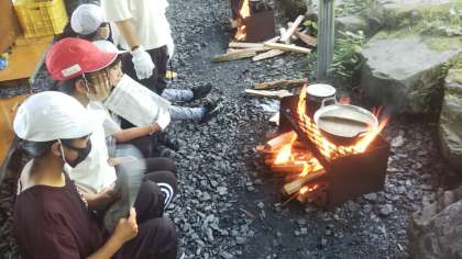 薪の組み方や具材の切り方等教えていただいたことをグループで実践します。なかなか火がつかないグループもありましたが、協力して準備を進めました。