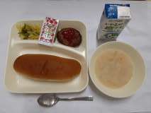 「焼きハンバーグ、豆乳スープ、キャベツとピーマンのカレーソテー、黒糖パン、牛乳」です。