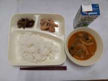 「鶏肉の照り焼き、なすのそぼろいため、かぼちゃのみそ汁、ごはん、牛乳」です。