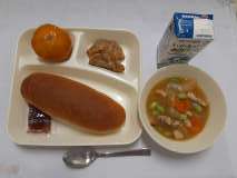 「揚げぎょうざ、鶏肉と冬瓜の中華煮、冷凍みかん、コッペパン、いちごジャム、牛乳」です。