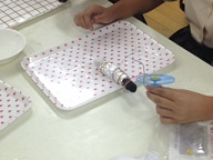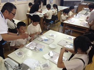 関西電気保安協会の皆さんに4年生の理科の出前授業をしていただきました。備長炭をつかった電池を作りました。炭と食塩水とアルミでどのようにして電気が起こるのか不思議ですね。