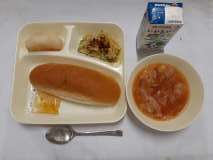 「豆乳マカロニグラタン[米粉]、トマトスープ、なし(二十世紀)、マーマレード、コッペパン、牛乳」でした。