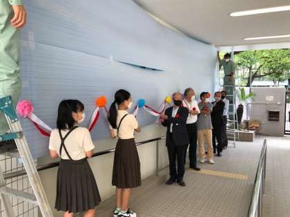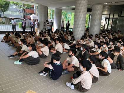 ピロティーには6年生、テレビを通して全校のみんなが参加しました。