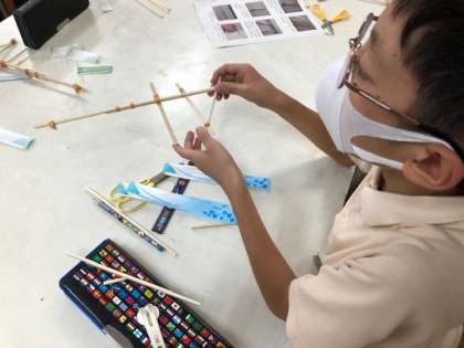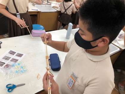 科学クラブは割りばし鉄砲を使っていました。どの部分の長さを調節したらよく飛ぶのかな?