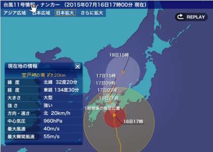 大型で非常に強い台風11号が近畿地方に接近しています。ニュース(資料はウェザーニュース17時現在です)によれば、16日の夜から17日にかけて四国や紀伊半島に上陸するおそれがあります。