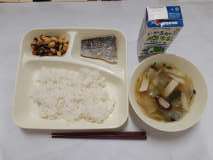 「さごしのごまじょうゆかけ、五目汁、大豆の煮もの、ごはん、牛乳」和食です。
