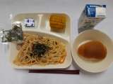 「きのこの和風スパゲッティ、焼きとうもろこし、固形チーズ、黒糖パン(1/2)、牛乳」です。