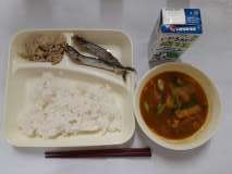 「焼きししゃも、まいたけとキャベツのいためもの、和風カレー汁、ごはん、牛乳」です。