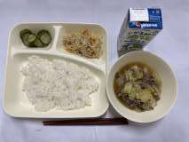 「すき焼き煮、もやしとささみのいためもの、きゅうりのゆず風味、ごはん、牛乳」です。