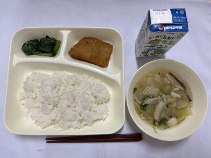 「たらフライ、小松菜のごまあえ、すまし汁、ごはん、牛乳」です。