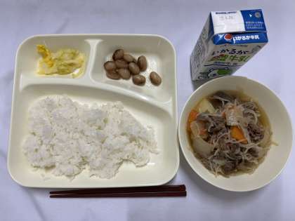 「肉じゃが、白菜のゆず風味、とら豆の煮物、ごはん、牛乳」です。
